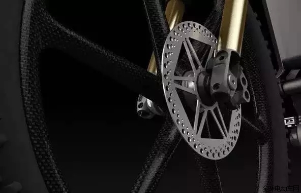 相比普通山地自行車而言,它更像是一款摩托車的簡易版,單薄的三角鋼架被更加陽剛的造型取代,又沒有肌肉賁張的臃腫感。為了更好地保護(hù)內(nèi)部的線纜和零部件,車身采用了軍用級(jí)別的 7075 鋁合金材料制作(該材料經(jīng)常運(yùn)用于飛機(jī)制造)。碳纖維制成的 26 寸六輻車輪,可以經(jīng)受堅(jiān)硬物體的高速?zèng)_擊。雖然沒有立體的美感,但是渾身暴漲的力量感,搭配輕量化的設(shè)計(jì),顯得更為激進(jìn)。
